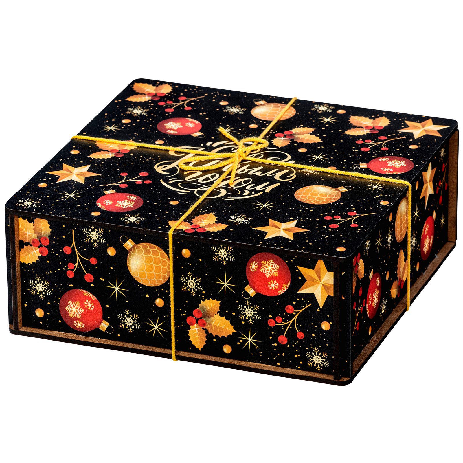 “Рождественская магия” - это новогодний сладкий подарок, отличающийся довольно строгим и оригинальным дизайном. Это небольшой деревянный ящичек темного цвета, украшенный новогодними иллюстрациями и перетянутый ярко-желтой веревкой. Внутри этого ящичка бережно хранятся отборные вкусные сладости и небольшой памятный сувенир в виде лошадки - символа 2026 года. Такой подарок идеально подойдет для поздравления любого взрослого сластены: воспитателя, классного руководителя, коллеги или начальника! Такой набор гарантированно вызовет приятные эмоции у того, кто его получит.