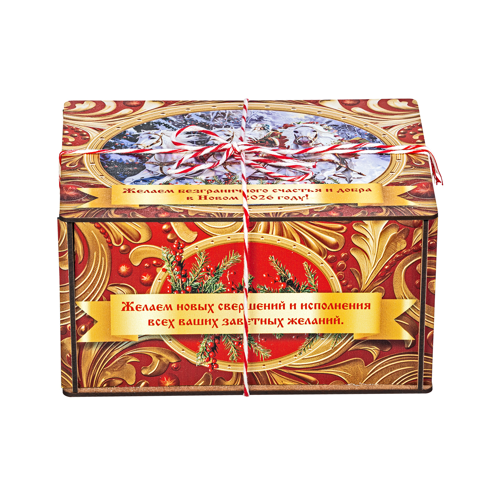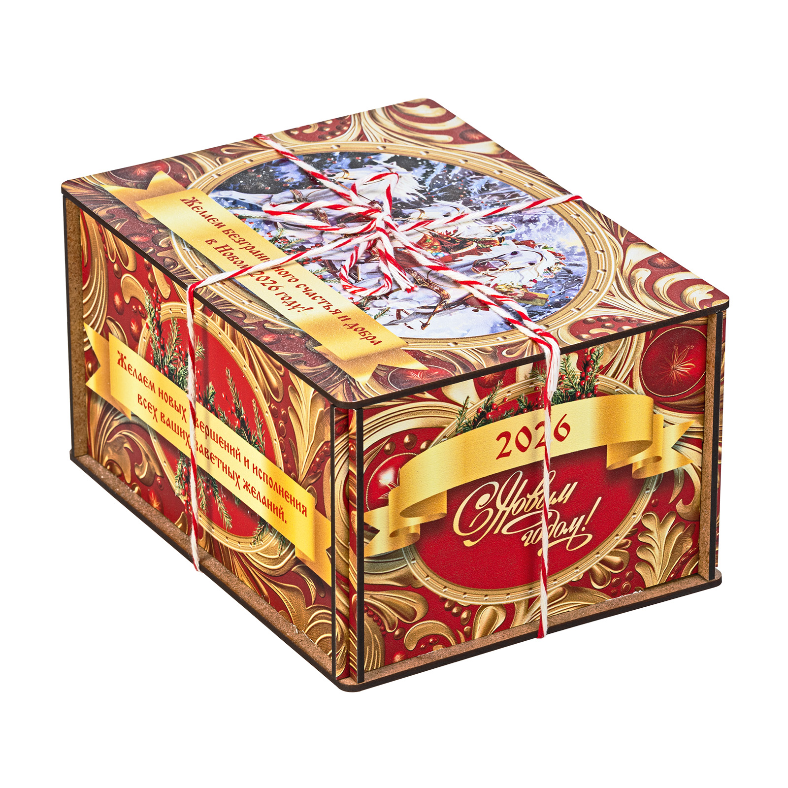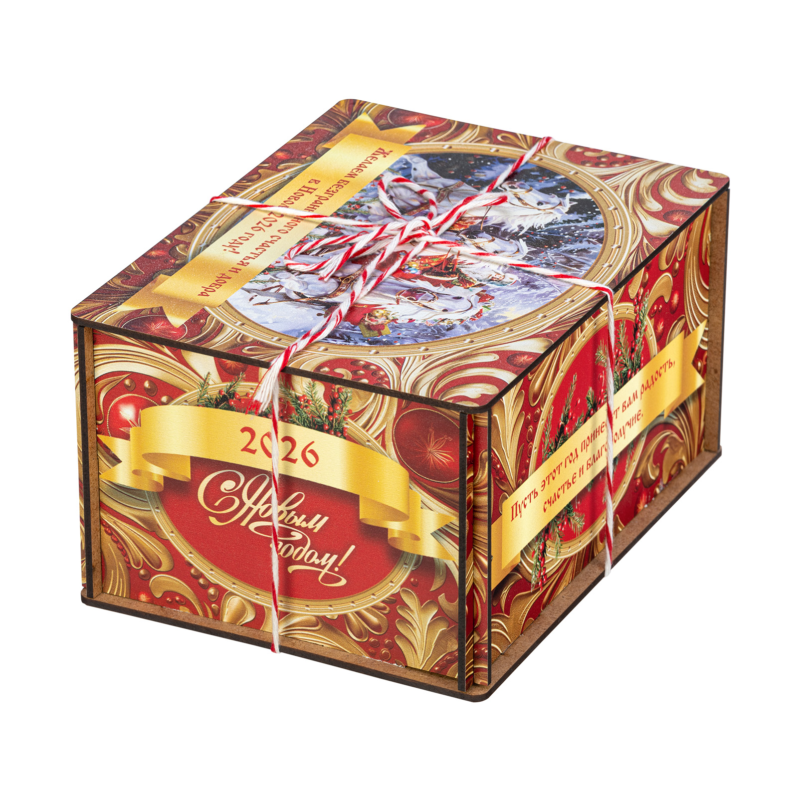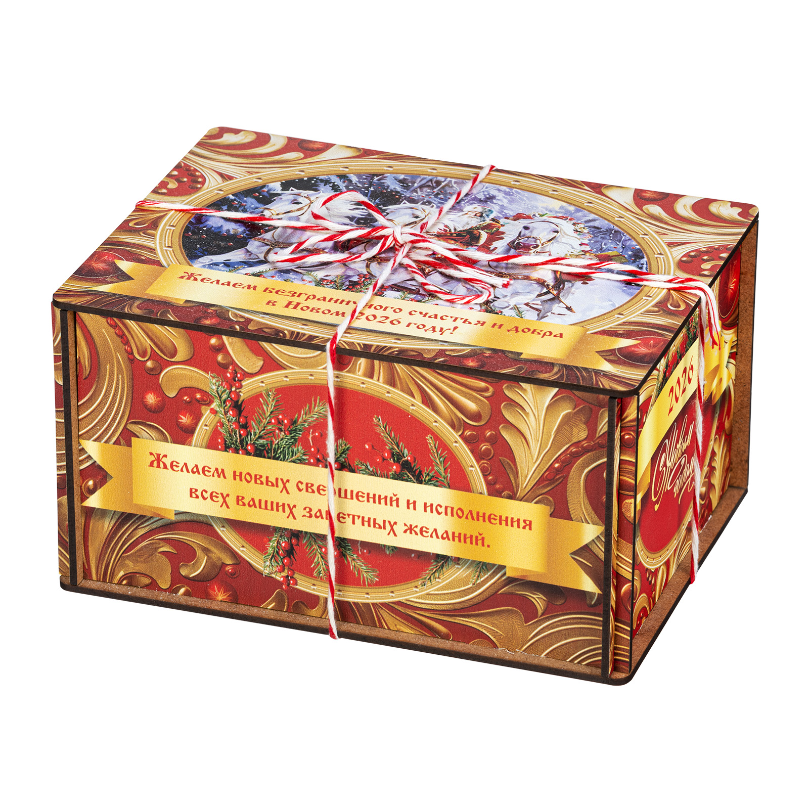 Ищете новогодний сладкий подарок подростку или взрослому? Присмотритесь к набору “Золотые узоры” - это оригинальный конфетный набор в яркой упаковке. В подарок входит килограмм вкусных и разнообразных кондитерских изделий от ведущих фабрик, а также небольшой памятный сувенир в виде символа наступающего 2026 года.  Сладости бережно упакованы в небольшой деревянный ящик, выполненный в сочетании золотого и красного цветов. На крышке есть небольшая иллюстрация с изображение Дедушки Мороза в упряжке белых грациозных лошадей. Упаковка аккуратно перетянута цветной ручкой шнурком, что еще больше добавляет ей привлекательности.